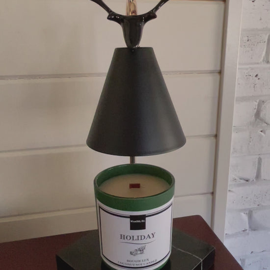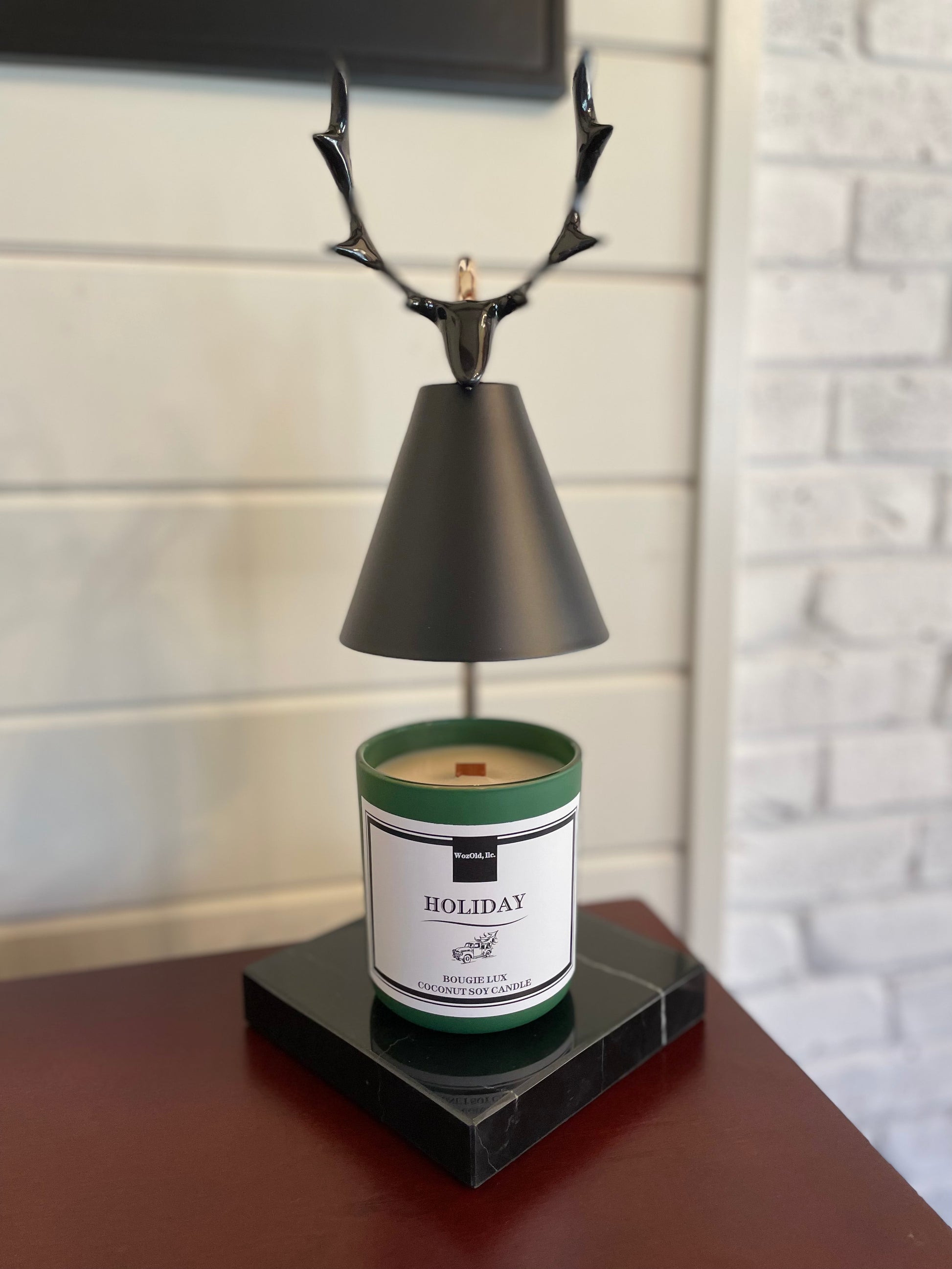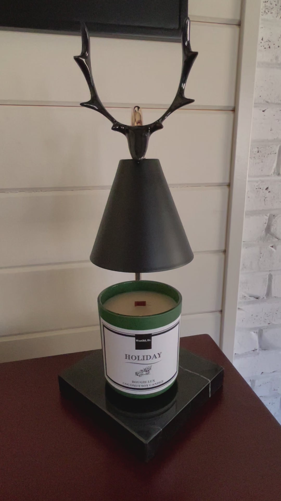 Elevate the scent of your candle with this opulent black marble base candle warming lamp. Included are magnetic Antlers to add any time of year to change up the look of the lamp. When antlers are added, it pairs perfectly with the HOLIDAY candle for a luxurious gift or to add warmth to your home around the holiday season. Remove the Antlers for a timeless lamp that can be enjoyed year-round. This exquisite lamp features a dimmer switch to create the perfect ambiance and complement the inviting aroma of your favorite BOUGIE LUX Candle. Also included: 2 Light bulbs.