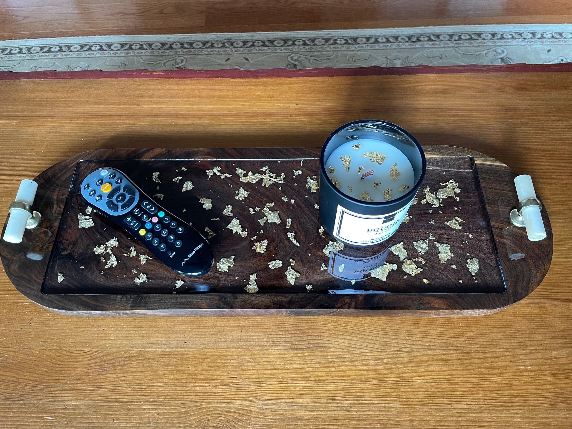 Transform your space with this stunning high gloss black walnut tray, perfect for showcasing your most cherished items. The shimmering gold flakes dance in the light, making this elegant tray a statement piece on any surface. The exquisite hardware adds that finishing touch of class to complete the "Bougie Lux" standard in luxury.