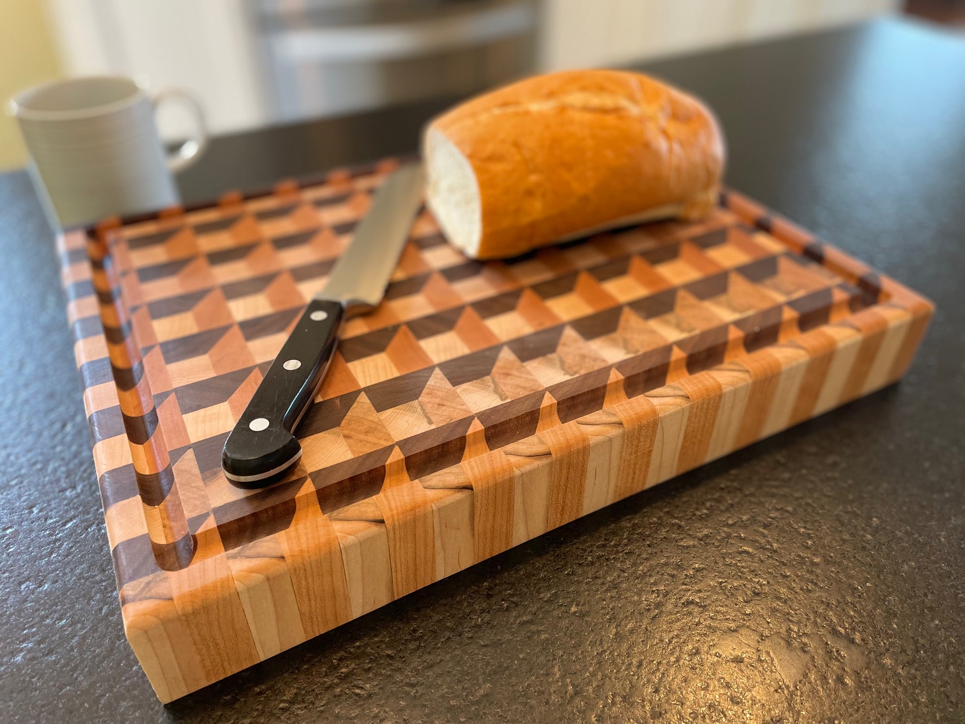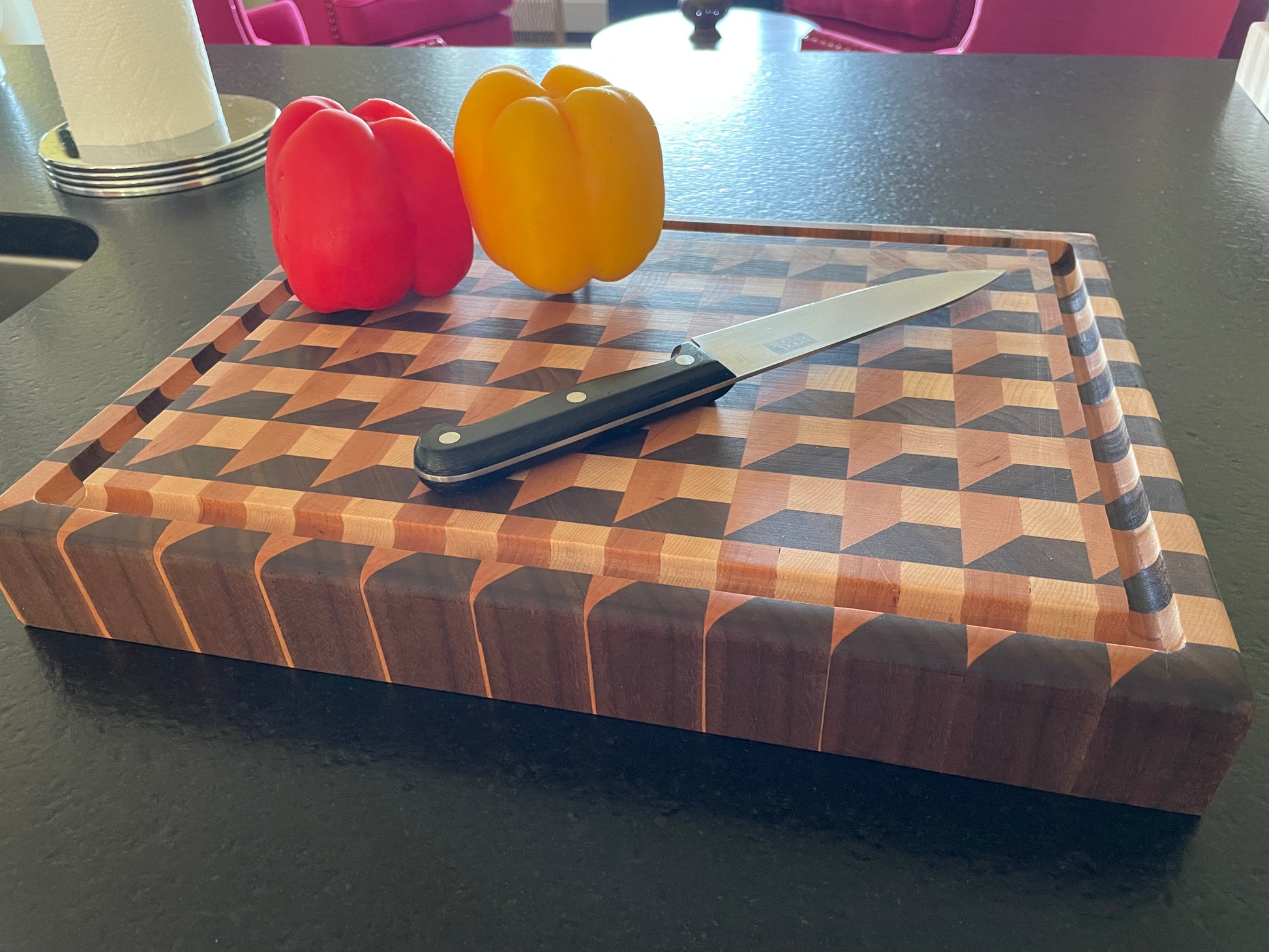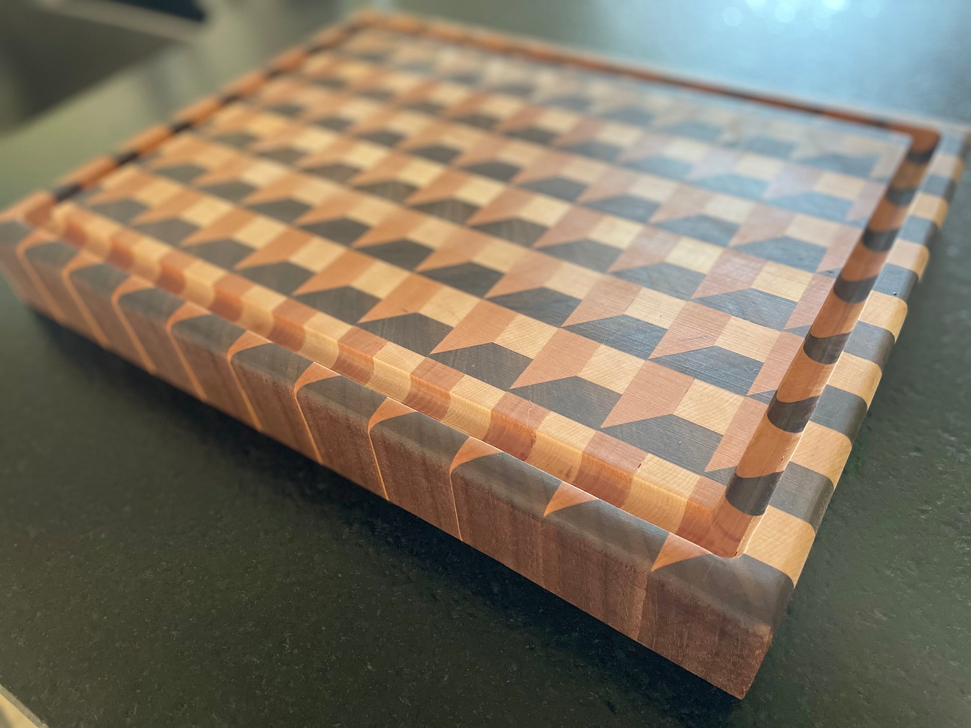 Take your dinner party to the next level with this sturdy, handcrafted cutting board featuring Maple, Black Walnut, and Cherry. Its intricate 3D design is sure to make a statement. The board is equipped with a juice groove and convenient hand grips for effortless handling. Simply clean with soap and water and it's ready for use once more. NOT Dishwasher Safe.